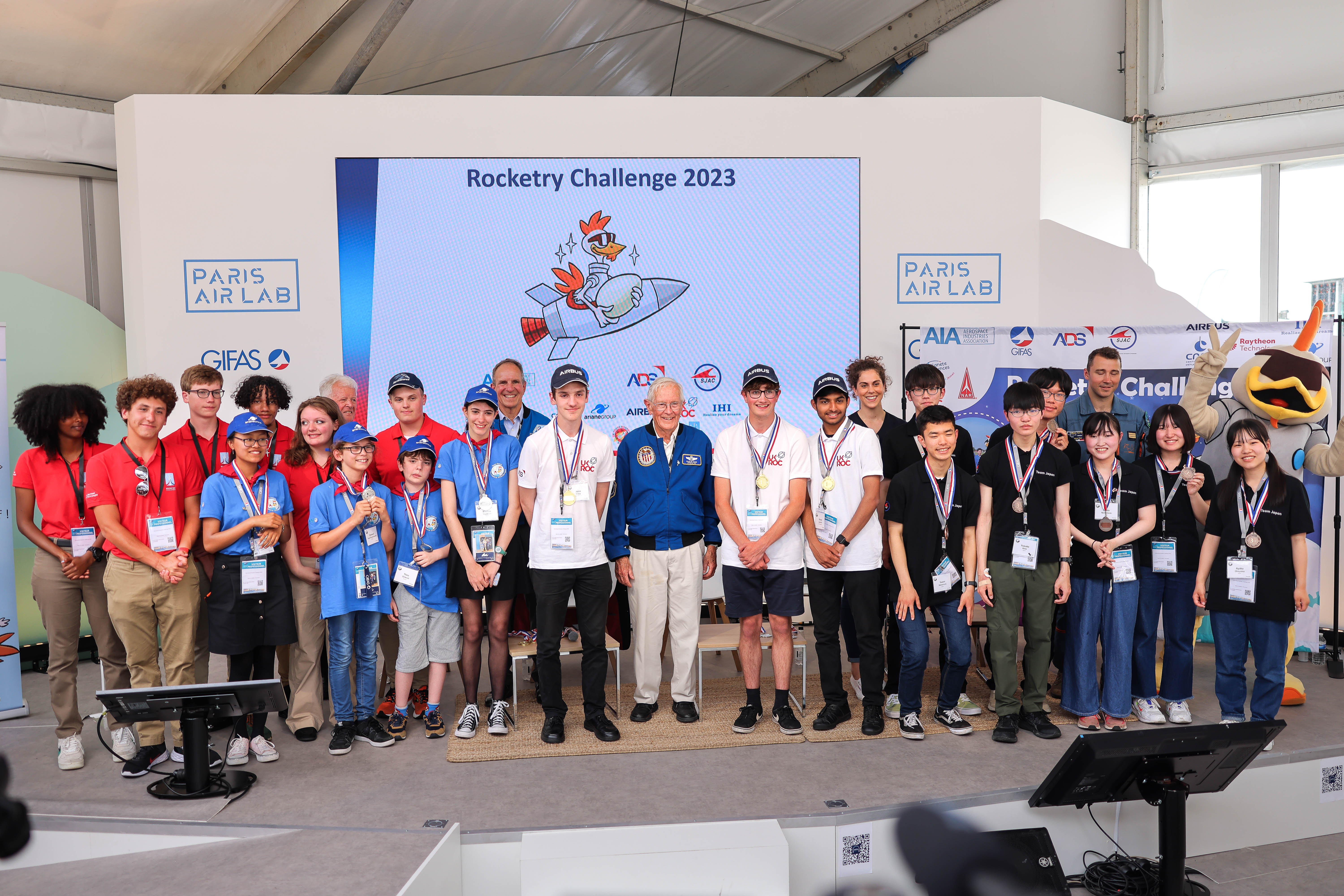 Le vendredi 23 juin 2023, au coeur du Salon, s’est déroulée la finale internationale du Rocketry Challenge. Ce concours de jeunes amateurs de 12 à 18 ans consiste à faire décoller un œuf cru à bord d’une fusée et à le récupérer intact à l’atterrissage.